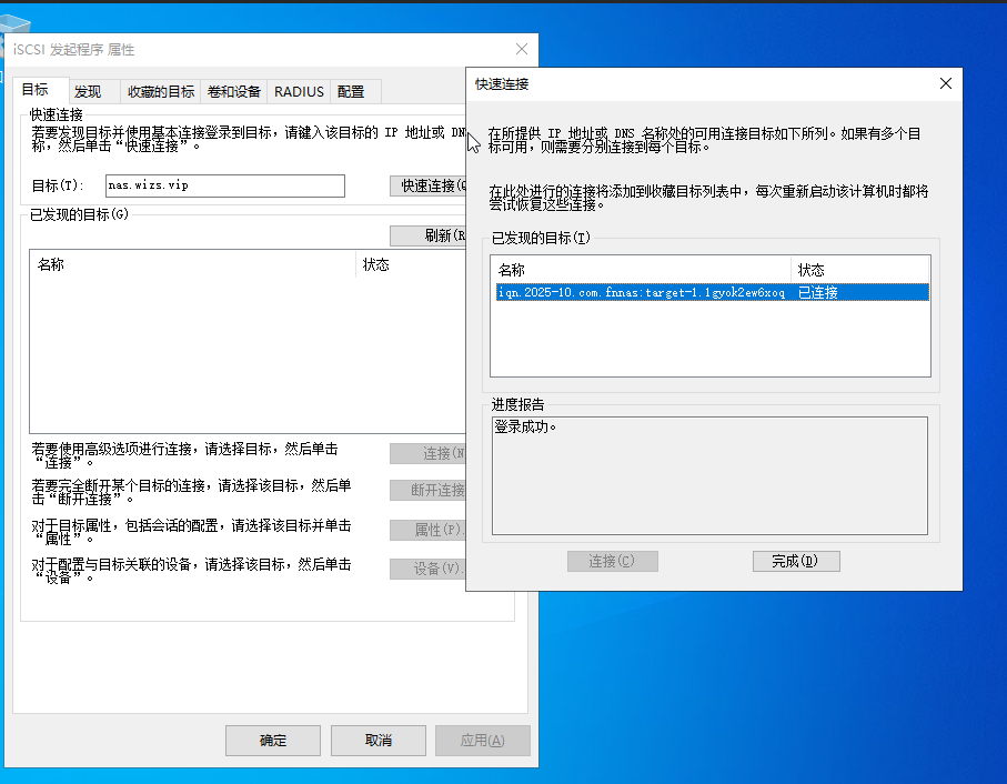 - 在目标中,选择要连接的 Target 的 IQN,点击连接