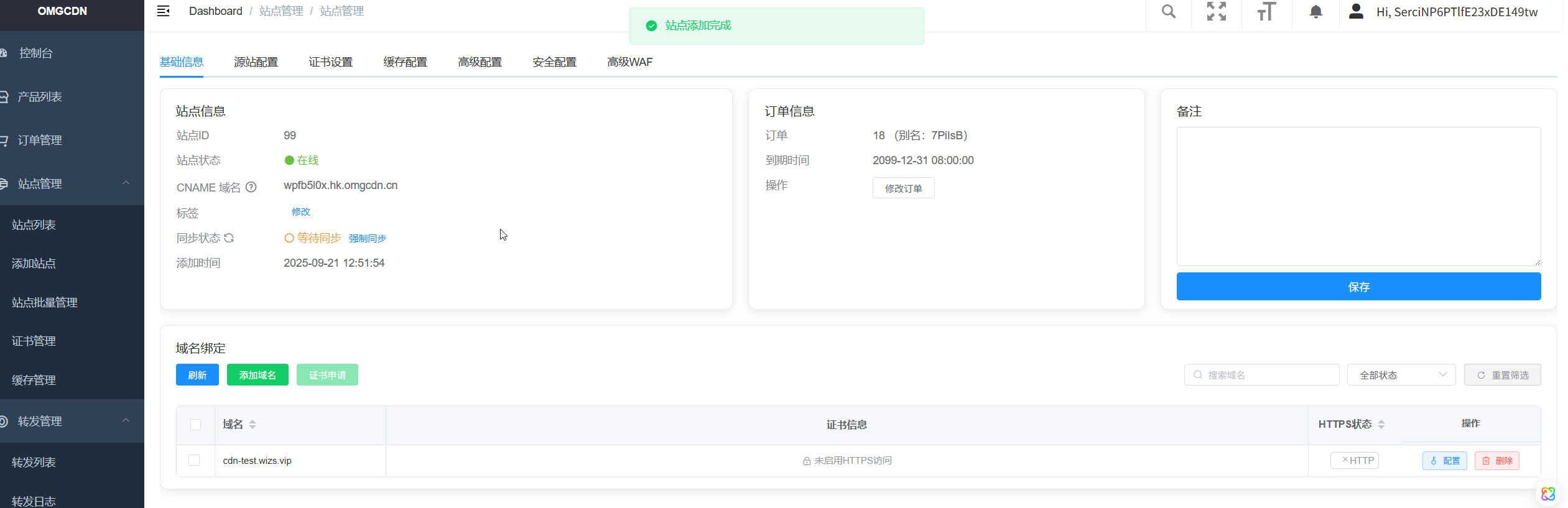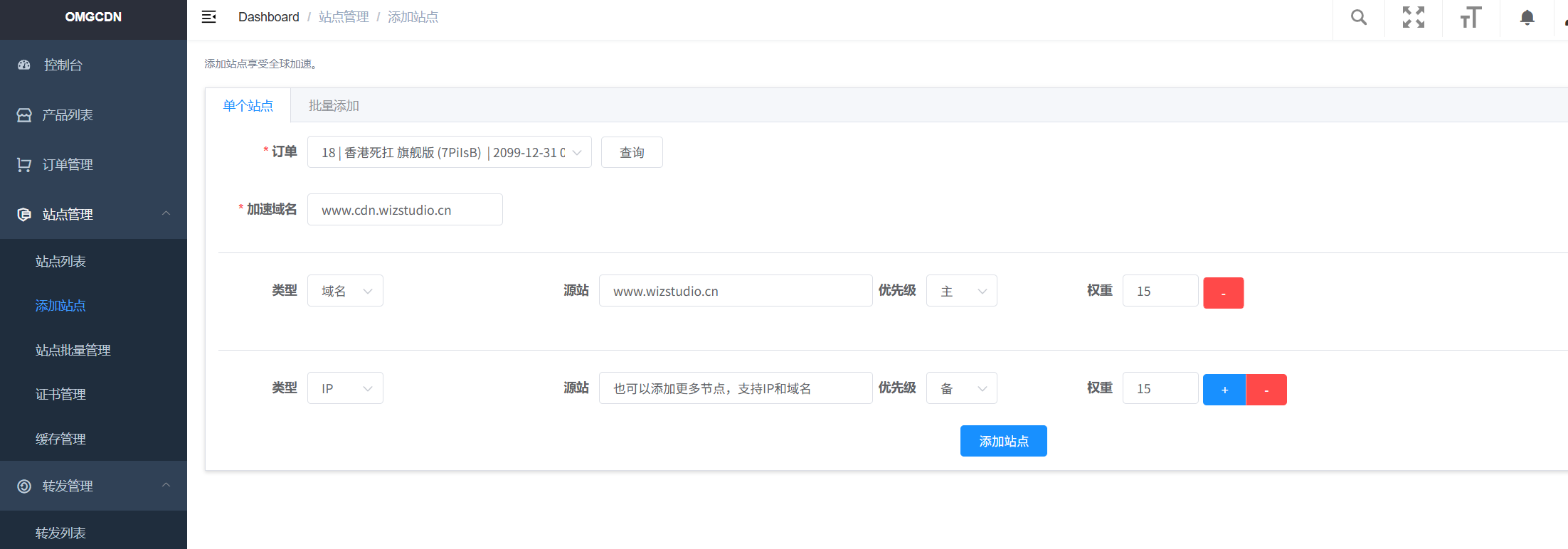 打开CDN主控地址(购买后可见),点击站点管理,选择添加站点。注意点如下: