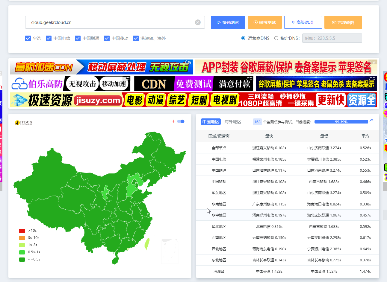 国内极限测试,基本可以做到国内全绿(极创云@cloud.geekrcloud.cn)使用的就是这个CDN。