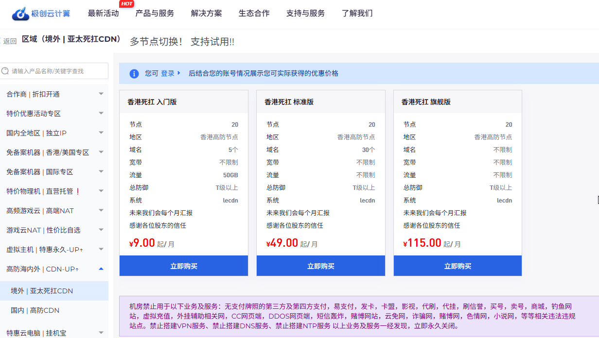 [推荐]49元/月 绑定30个域名 每月流量不限制 防御T级以上