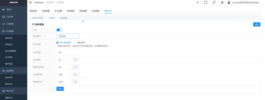 - 5. 独家URL级CC防御规则,开启后,只对被攻击URL进行人机认证,不影响其它页面访问提高体验