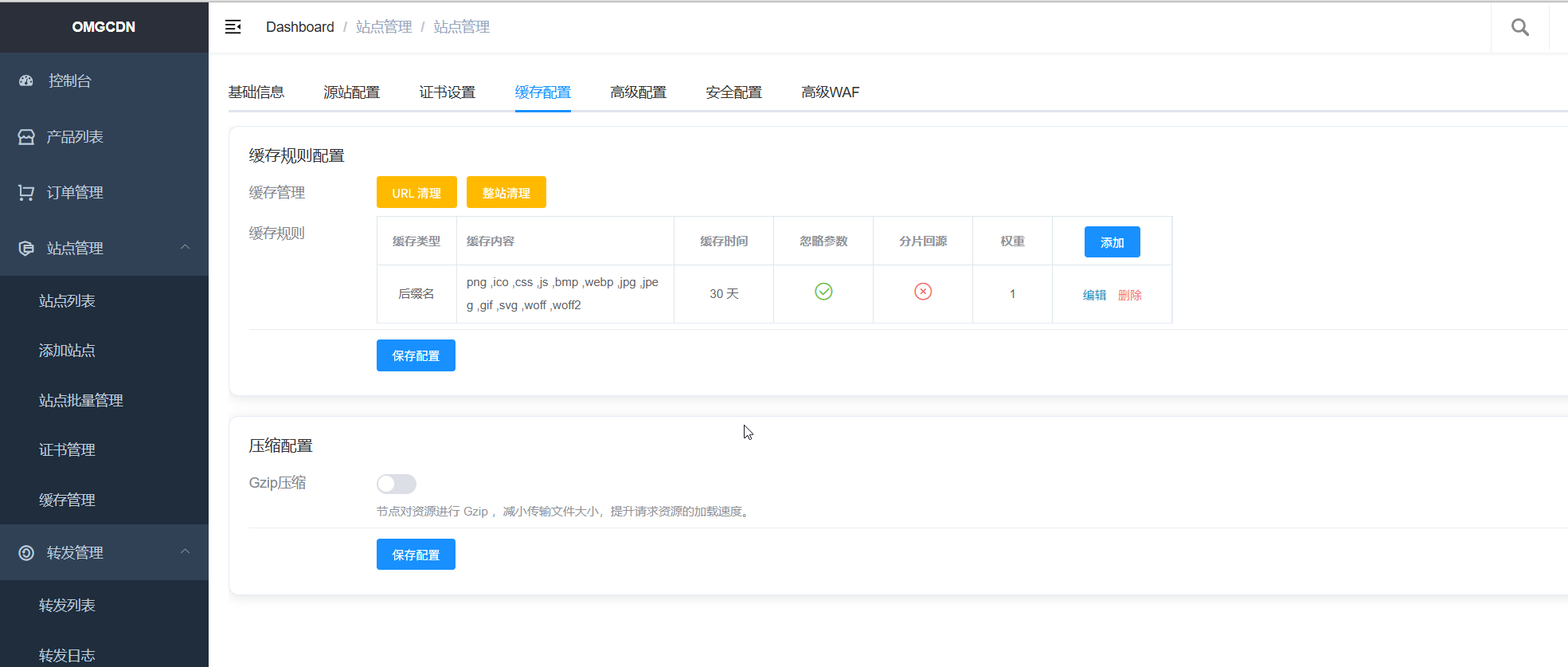 - 缓存配置可以自定义规则配置,GZIP也可以正常使用,压缩等级可以选择1-6(日常情况4-6级处于效果和性能的最佳点)