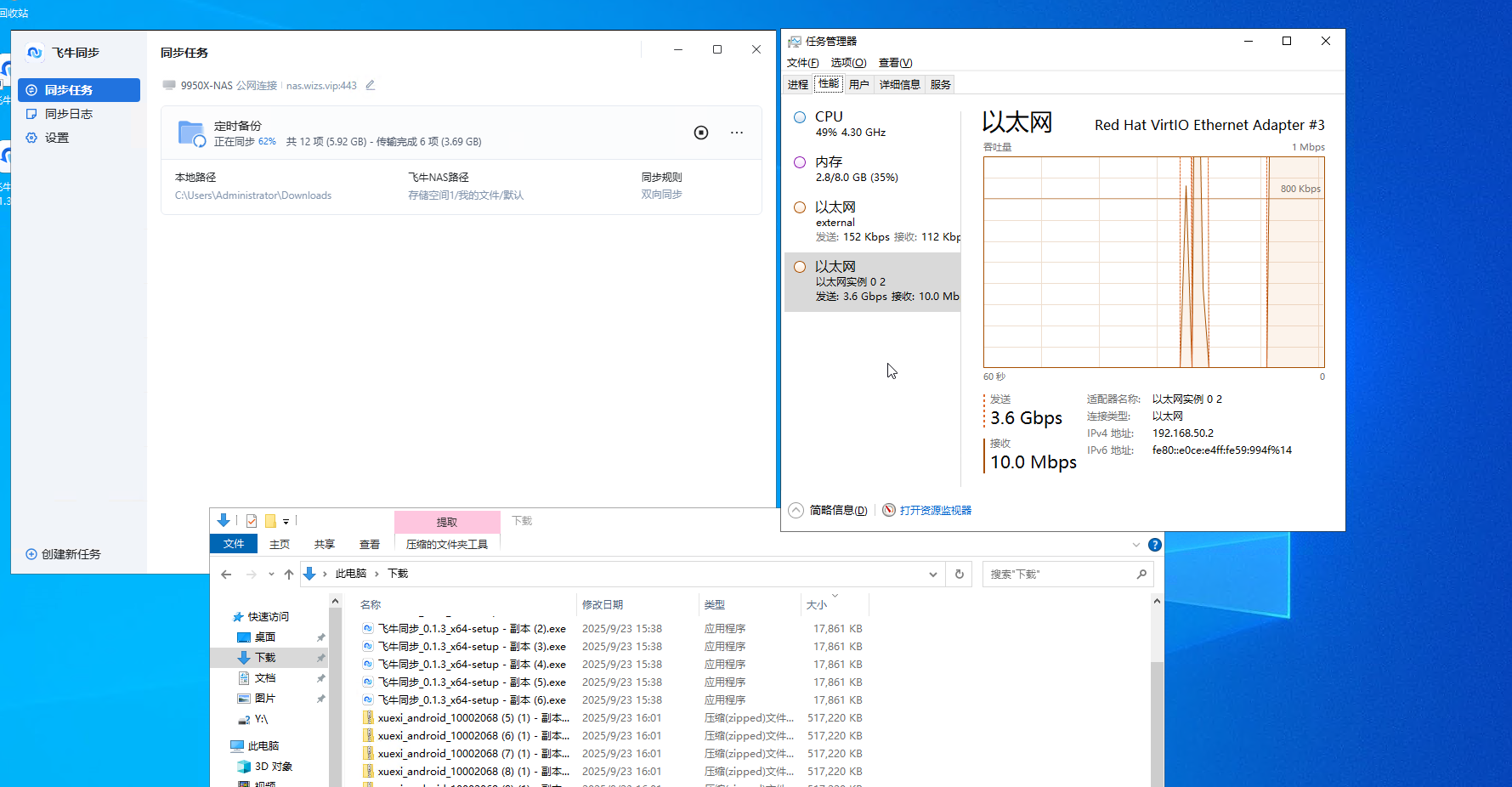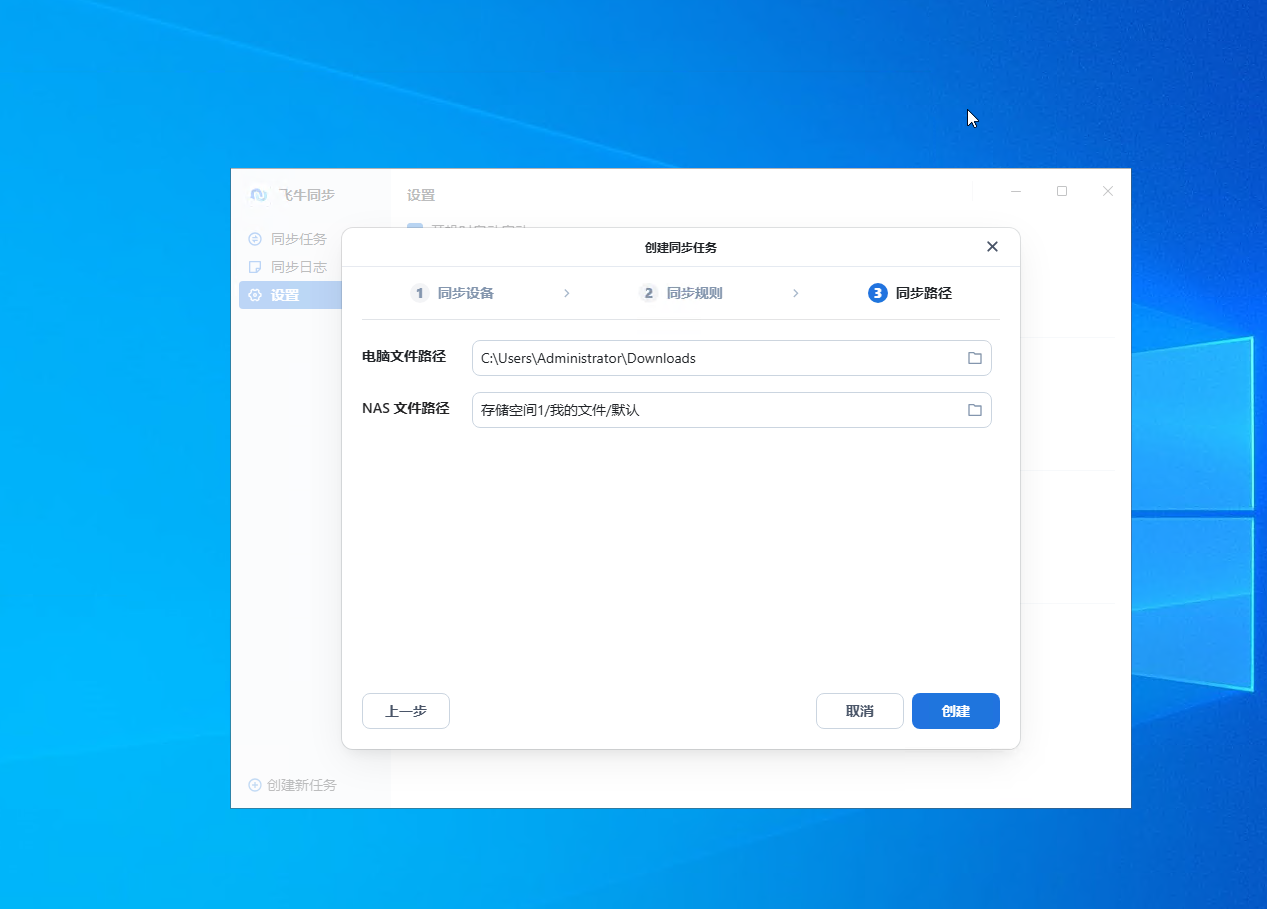 3 - 选择备份目录和NAS目录,点击下一步即可,接下来就可以自动备份了。这台无限速的测试机内网轻松跑到3Gbps+。