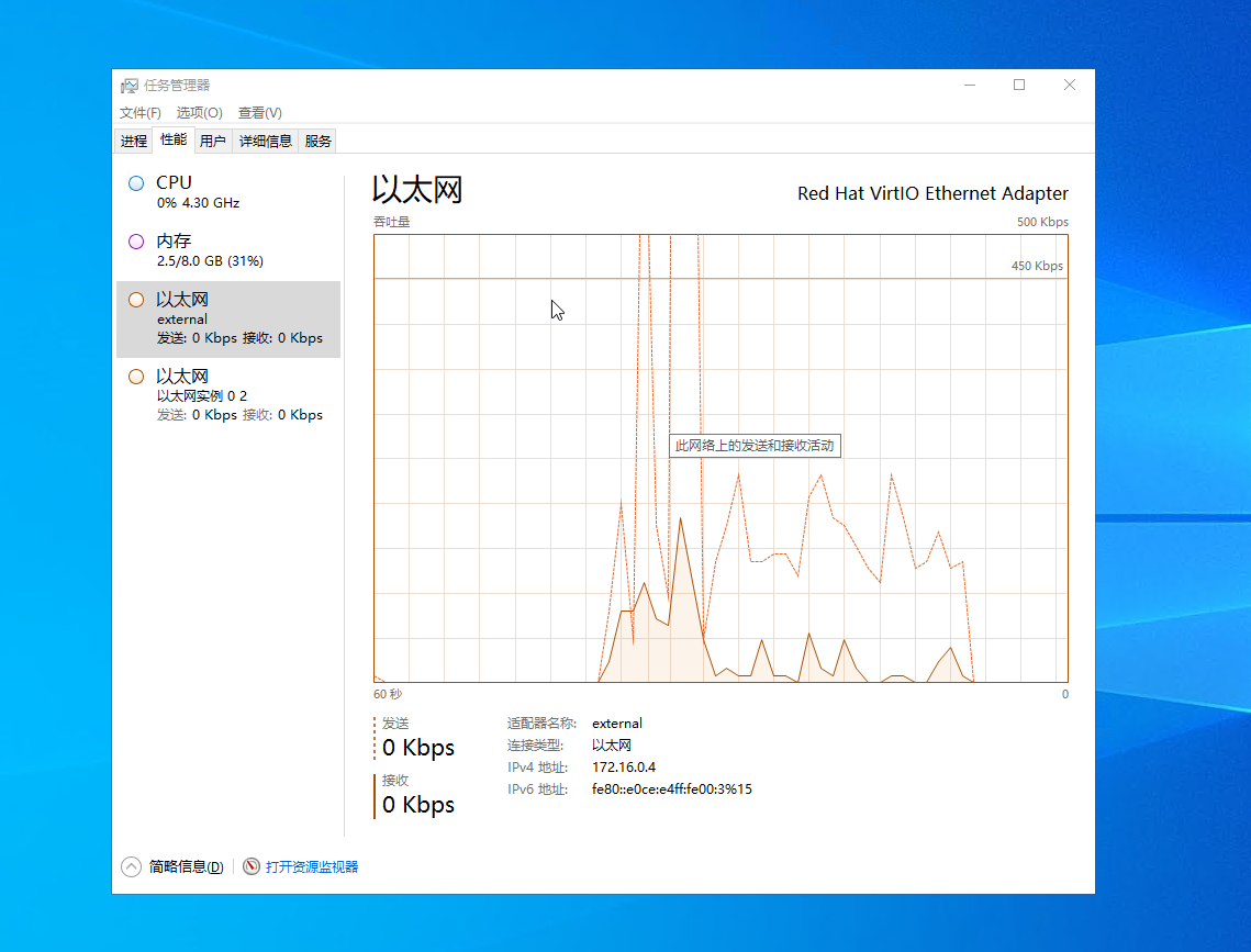 看到下方有两个Red Hat开头的网卡,任务管理器内有一个192.168.50.x的IP,对应的网卡一般是# x