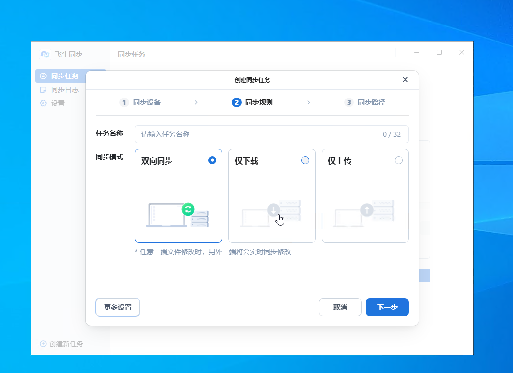 2 - 选择你需要的备份方式,支持的模式如下,单项、双向均可,高级模式中可以设置后缀、文件大小不同步或者仅符合标准同步。
