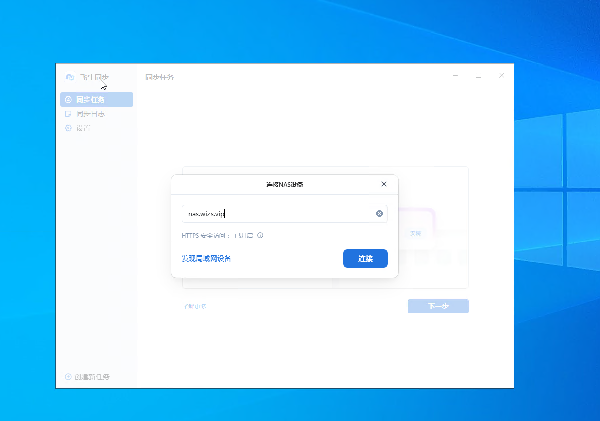 1 - 下载安装后,点击左下角创建新任务,这里记得手动输入,nas.wizs.vip:443(一定加端口!!!),不要用下面的局域网设备,不然有限速,大概只有3MB/s,受限于你的公网上行IP速度。